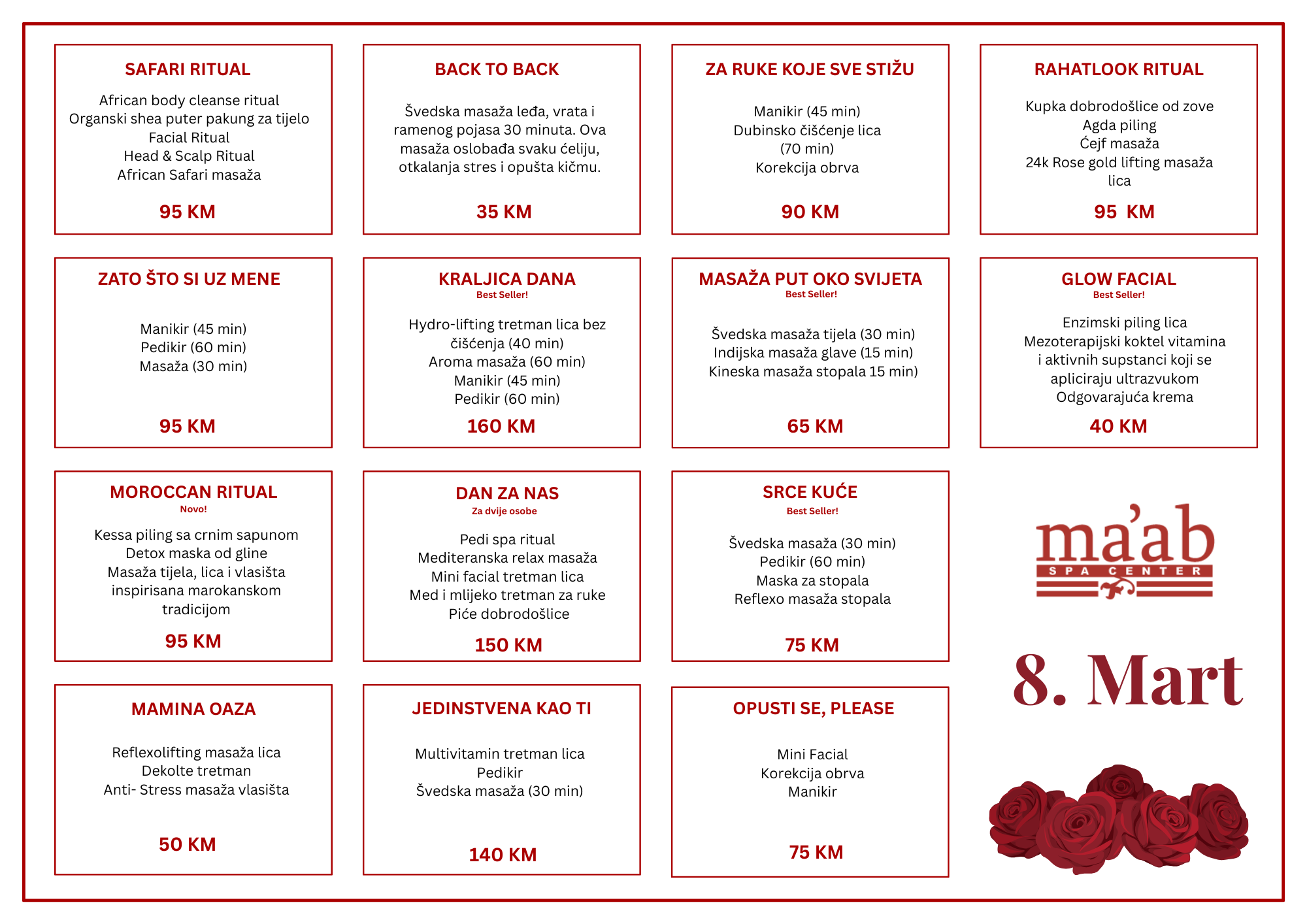 Poklon bonovi isključivo povodom praznika 8. Mart, u ponudi od 28.2. do 10.03.2026. Poklon bonovi se mogu kupiti na recepciji Ma’ab Spa Centra ili nas kontaktirajte da Vam objasnimo kako možete uplatiti online i dobiti elektronski poklon bon. Poklon bon možete iskoristiti tako što ćete spomenuti ime paketa prilikom zakazivanja ili online. Poklon bonovi vrijede godinu dana od dana izdavanja. Poklon bon nije moguće produžiti nakon isteka roka. Tretmani u poklon bonovima se mogu iskoristiti sve u jednom danu ili se mogu razdvojiti u više dana kako Vama odgovara.